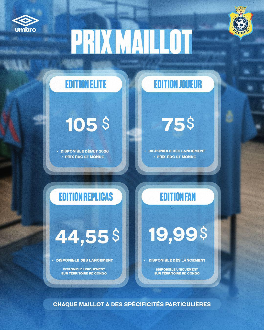 La Fédération congolaise de football association (FECOFA), en partenariat avec l’équipementier Umbro, a dévoilé ce samedi 20 décembre 2055, les différents prix des maillots officiels des Léopards de la République démocratique du Congo. Quatre éditions sont proposées afin de permettre à chaque supporter de soutenir l’équipe nationale selon ses moyens et ses préférences.